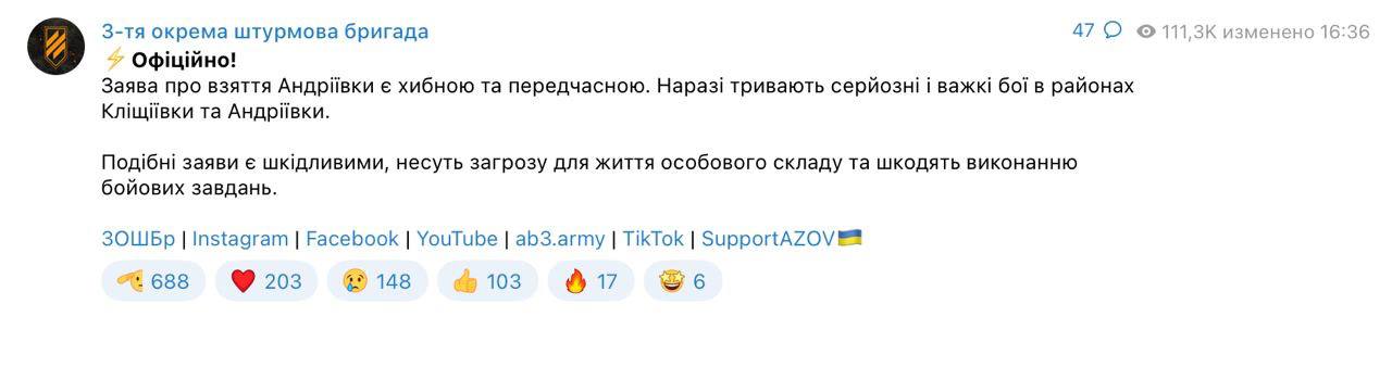 "В 3-й ОШБр достаточно развита медийная составляющая, чтобы она могла самостоятельно сообщить о взятии населенного пункта", - анонимно сказал паблику один из бойцов бригады.