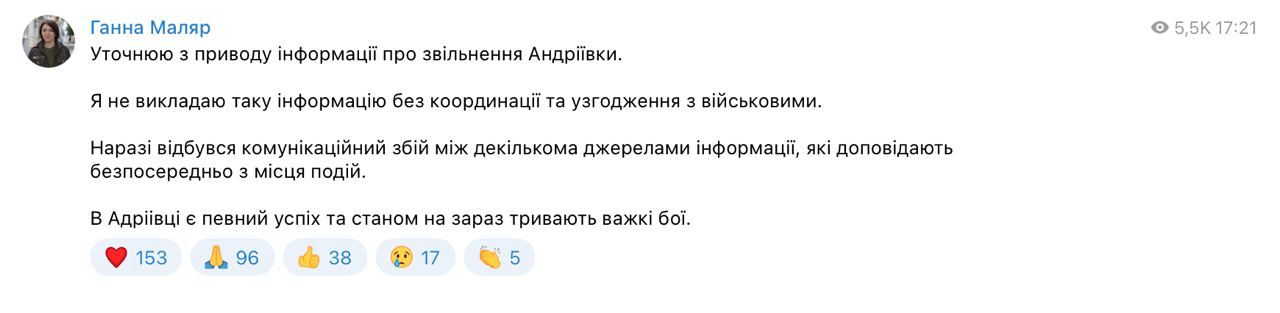 17.40 Замминистра обороны Маляр пишет, что опубликовала заявление об освобождении Андреевки после согласования с военными, но произошел «коммуникационный сбой».