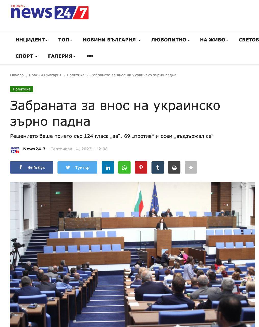"Принимая во внимание солидарность Республики Болгария с Украиной, Болгария не поддерживает продолжение после 15 сентября 2023 года чрезвычайной меры, запрещающей импорт в Республику Болгарию, Республику Польша, Венгрию, Румынию и Словацкую Республику пшеницы, кукурузы, рапса и семян подсолнечника из Украины", - говорится в решении парламента.