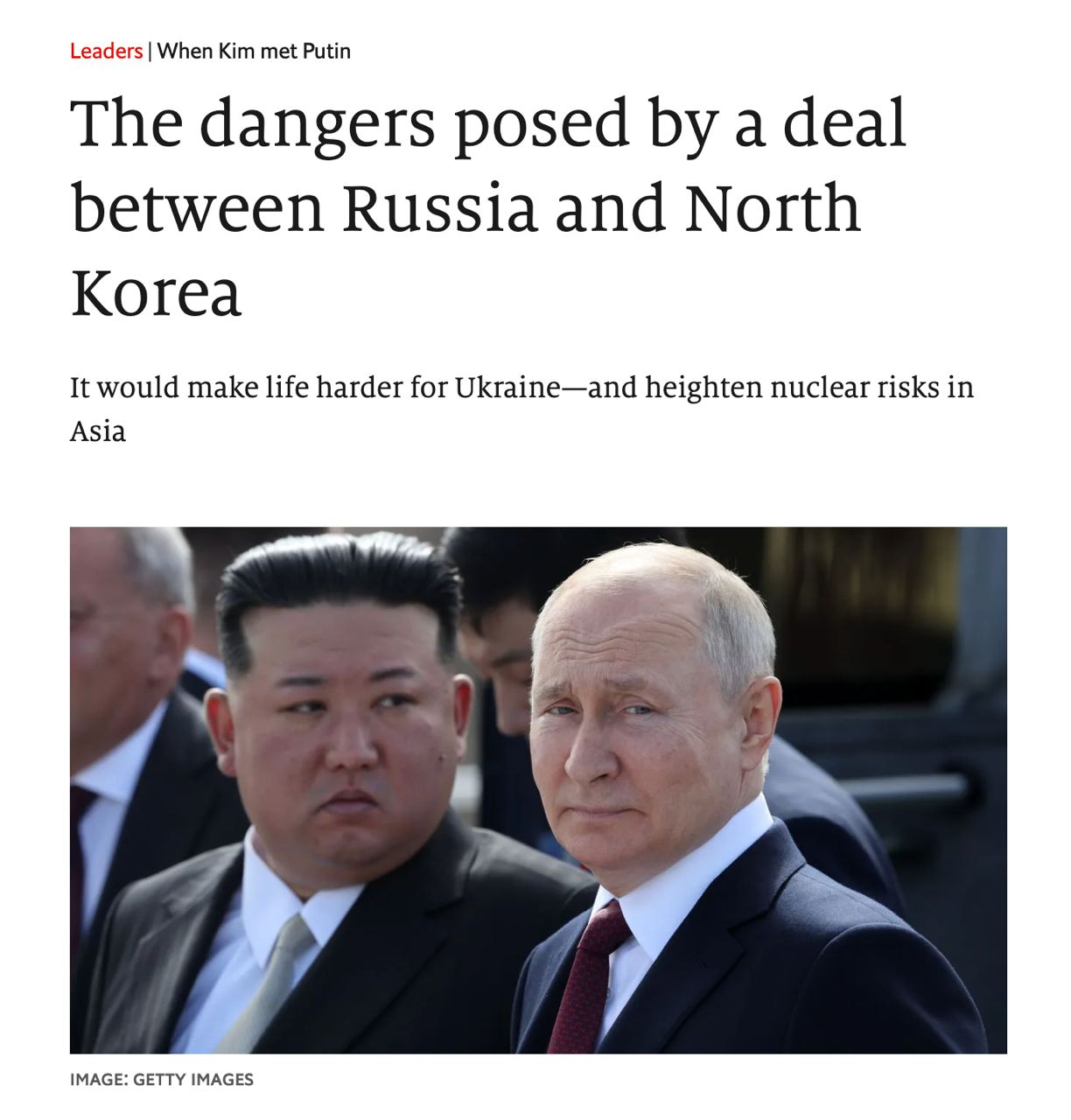 Для Украины передача РФ северокорейских боеприпасов будет означать перекос установившегося недавно паритета обратно в сторону Кремля, а значит, замедление продвижения ВСУ в ближайшие зимние месяцы, пишет The Economist.