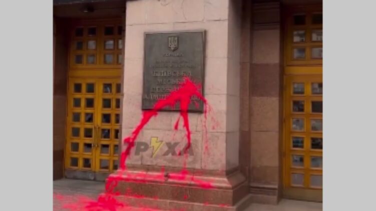 В частности, один из участников митинга в Киеве облил краской табличку на здании КГГА. Потом он заявил, что ему разбили нос. В столичной мэрии заявляют, что он психически ненормальный.