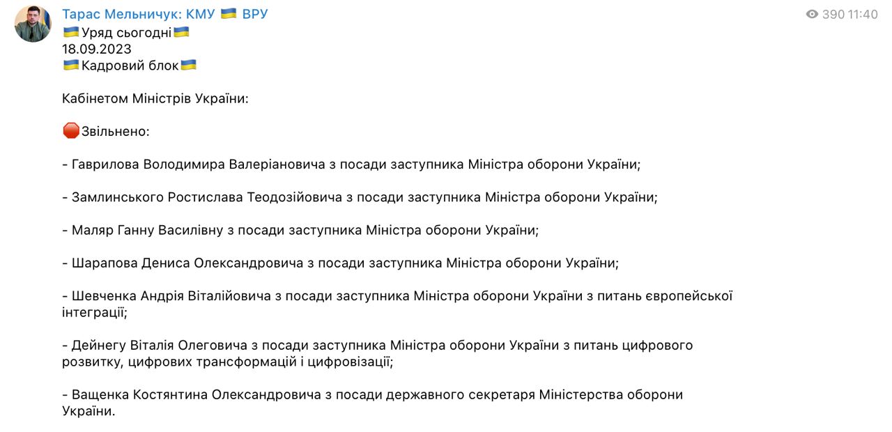 Уволены с должностей заместителей министра обороны: Анна Маляр, Денис Шарапов, Владимир Гаврилов, Ростислав Замлинский. Кроме того, с должности заместителя министра обороны Украины по вопросам европейской интеграции уволен Андрей Шевченко, а с должности заместителя по вопросам цифрового развития, цифровых трансформаций и цифровизации Виталий Дейнега.