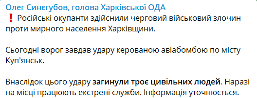 "Сегодня враг нанес удар управляемой авиабомбой по городу Купянск. В результате этого удара погибли трое гражданских людей. В настоящее время на месте работают экстренные службы. Информация уточняется", - написал Синегубов.