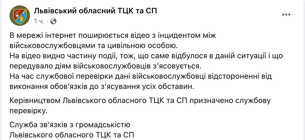 По инциденту с избиением мужчины в ТЦК города Самбор будет проведена служебная проверка.