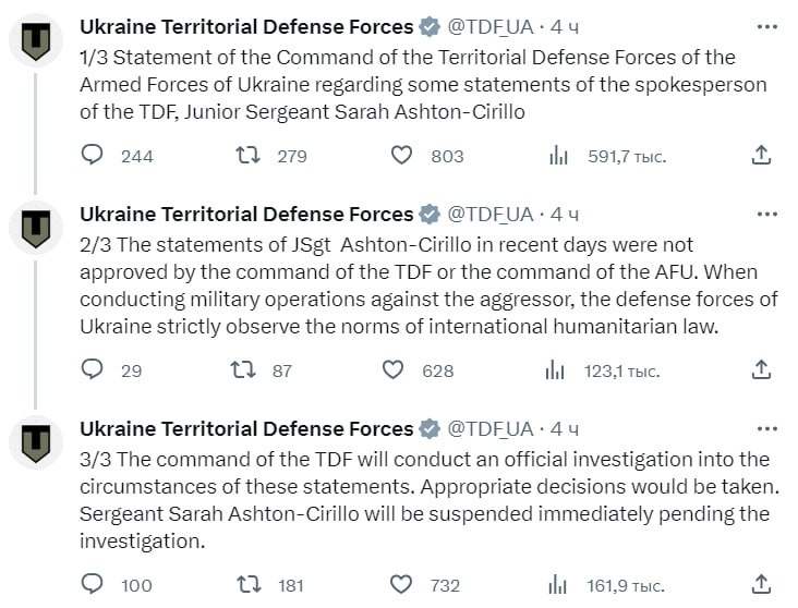 "Заявления сержанта Эштона-Чирилло в последние дни не были одобрены командованием ТРО и командованием ВСУ. При проведении военных действий против агрессора Силы обороны Украины строго соблюдают нормы международного гуманитарного права. Командование ТРО проведет служебное расследование обстоятельств этих заявлений. Будут приняты соответствующие решения. Сержант Сара Эштон-Чирилло будет немедленно отстранена от должности до завершения расследования", – говорится в записи.