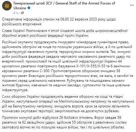 Утром 22 сентября Генштаб ВСУ обнародовал сводку о ситуации на фронте.