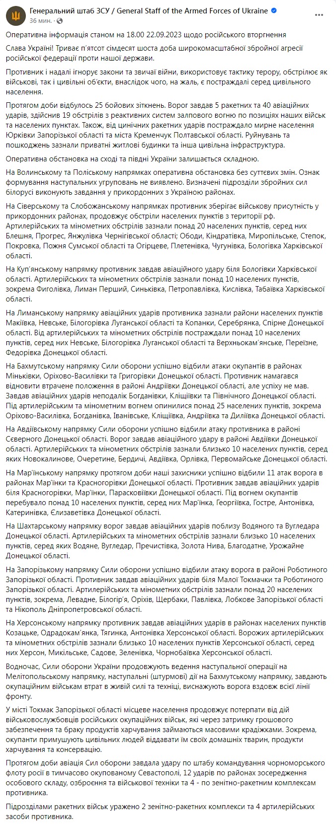 Генеральный штаб ВСУ опубликовал оперативную информацию о ситуации на фронте по состоянию на 18:00 22 сентября.
