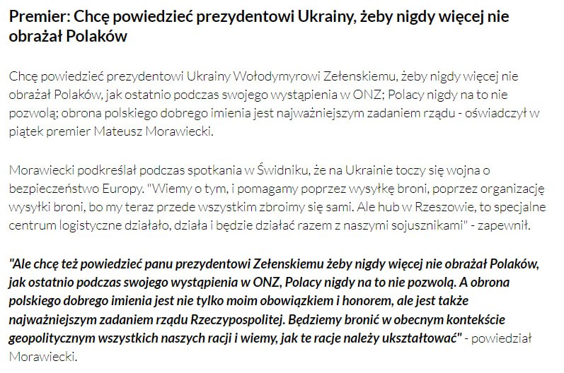 "Я хочу сказать президенту Зеленскому, чтобы он больше никогда не оскорблял поляков, как он это сделал недавно во время своего выступления в ООН. Поляки этого не допустят. И защита польского доброго имени - это не только мой долг и честь, это важнейшая задача правительства республики. В нынешнем геополитическом контексте мы будем отстаивать все наши аргументы", - приводит агентство слова Моравецкого.