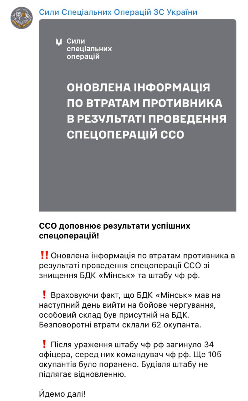 Также ВСУ заявляют, что безвозвратные потери в результате удара по большому десантному кораблю "Минск" составили 62 человека.