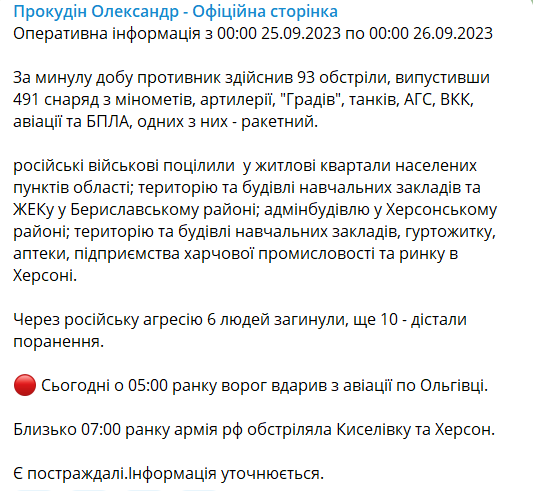 "Сегодня в 05:00 утра враг ударил из авиации по Ольговке. Около 07:00 утра армия России обстреляла Киселевку и Херсон. Есть пострадавшие. Информация уточняется", - написала Прокудин.