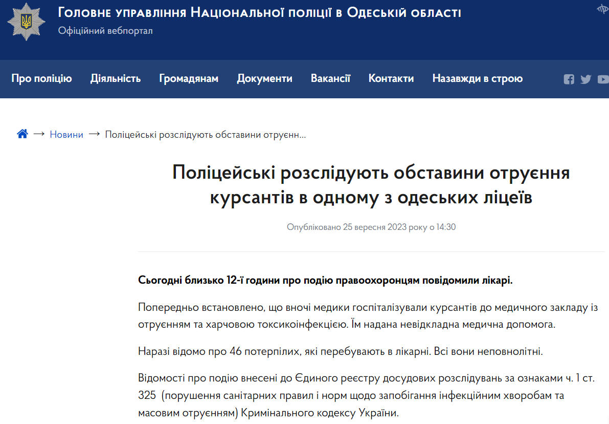 Он также добавил, что по данному факту возбуждено уголовное производство по ч.1 ст.325 УК Украины (нарушение санитарных правил и норм по предотвращению инфекционных болезней и массовых отравлений).