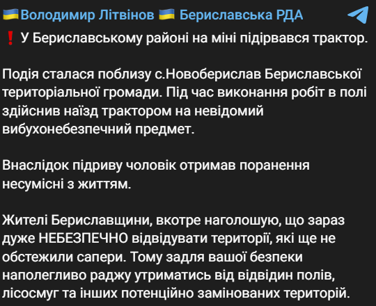 "Событие произошло вблизи села Новоберислав Бериславской территориальной общины. При выполнении работ в поле совершен наезд трактором на неизвестный взрывоопасный предмет", - написал Литвинов.
