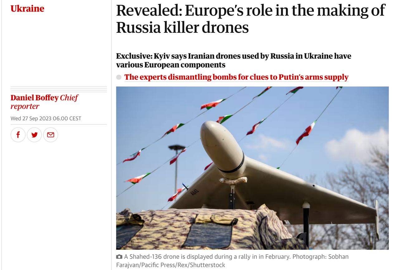 Украина заявила, что "Шахеды" имеют 52 европейских компонента пяти компаний со штаб-квартирами в США, Швейцарии, Нидерландах, Германии, Канаде, Японии и Польше. Почти весь импорт деталей в Иран идет из Турции, Индии, Казахстана, Узбекистана, Вьетнама и Коста-Рики.