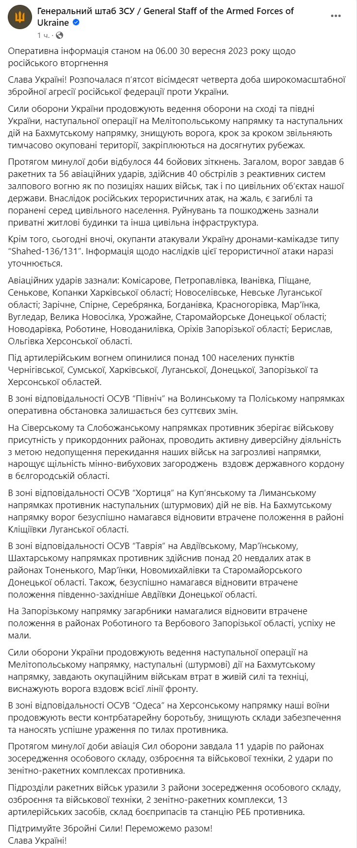 За прошедшие сутки произошло 44 боевых столкновений. Россия нанесла 6 ракетных и 56 авиационных ударов, совершила 40 обстрелов из реактивных систем залпового огня по позициям наших войск и по гражданским объектам.