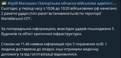 Войска РФ нанесли два ракетных удара по Запорожской области, пять человек ранены