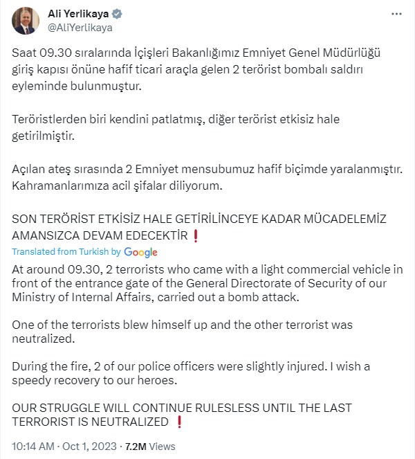 Об этом сообщил в соцсети X глава МВД Али Ерликая. Кадры теракта публикуют турецкие СМИ.