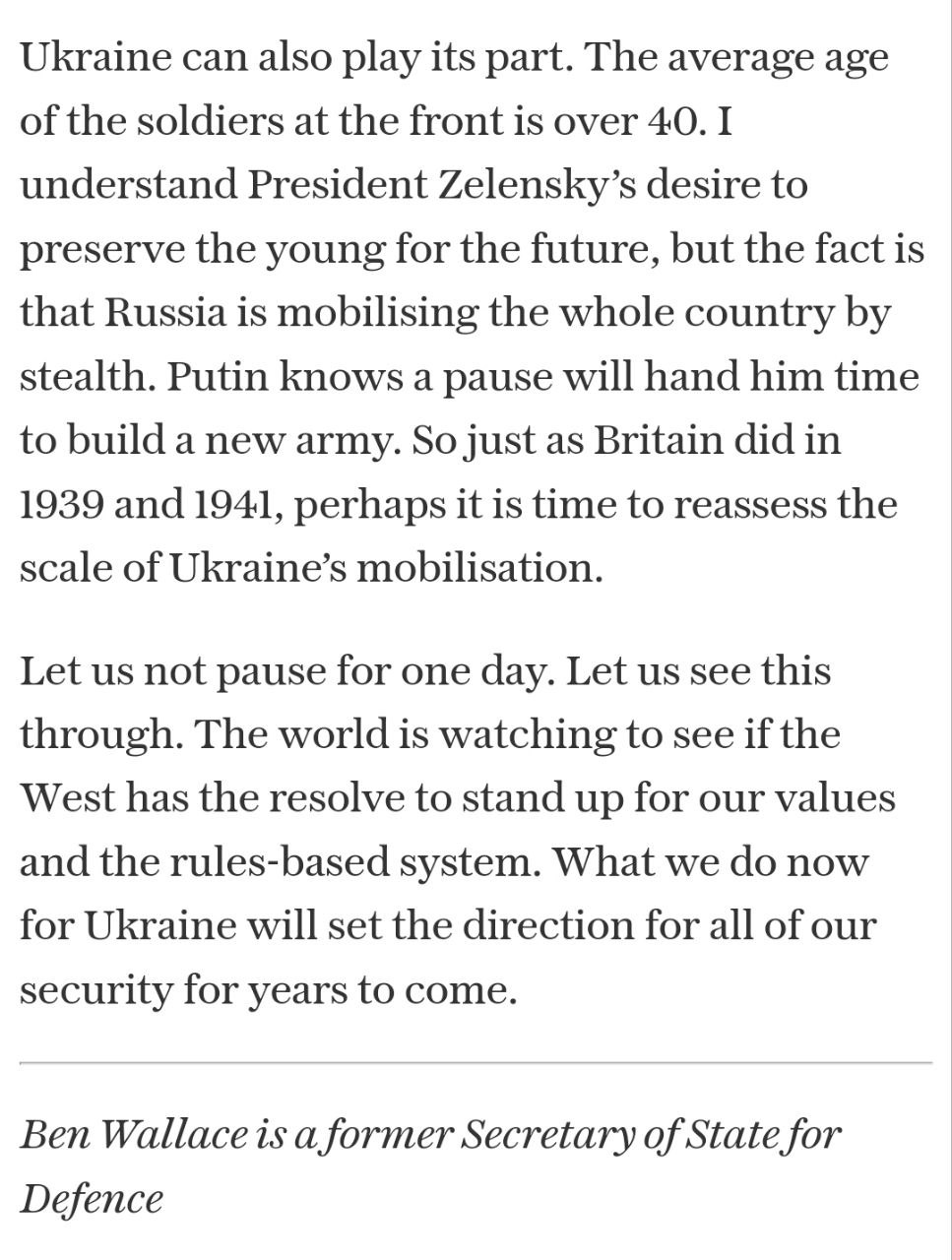 "Средний возраст солдат на фронте – за 40. Я понимаю стремление президента Зеленского сохранить молодёжь для будущего, но правда в том, что Россия тайком мобилизует всю страну. Так что, как это сделала Великобритания в 1939 и 1941 годах, возможно, пришло время переоценить масштабы украинской мобилизации", - заявил Уоллес.