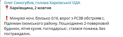 08.22 Прошлой ночью, около 00:16, враг из РСЗО обстрелял с. Подлиман Изюмского района. Поврежден 2-этажный дом, летняя кухня, хозяйственные, произошел пожар. Обошлось без пострадавших.