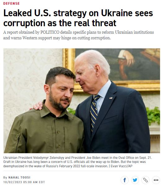 "В нем подчеркивается, что коррупция может привести к тому, что западные союзники откажутся от помощи Украине в борьбе против вторжения России, и что Киев не может откладывать усилия по борьбе с коррупцией. Существование коррупции на высшем уровне может подорвать доверие украинской общественности и иностранных лидеров к правительству военного времени", - пишет POLITICO.