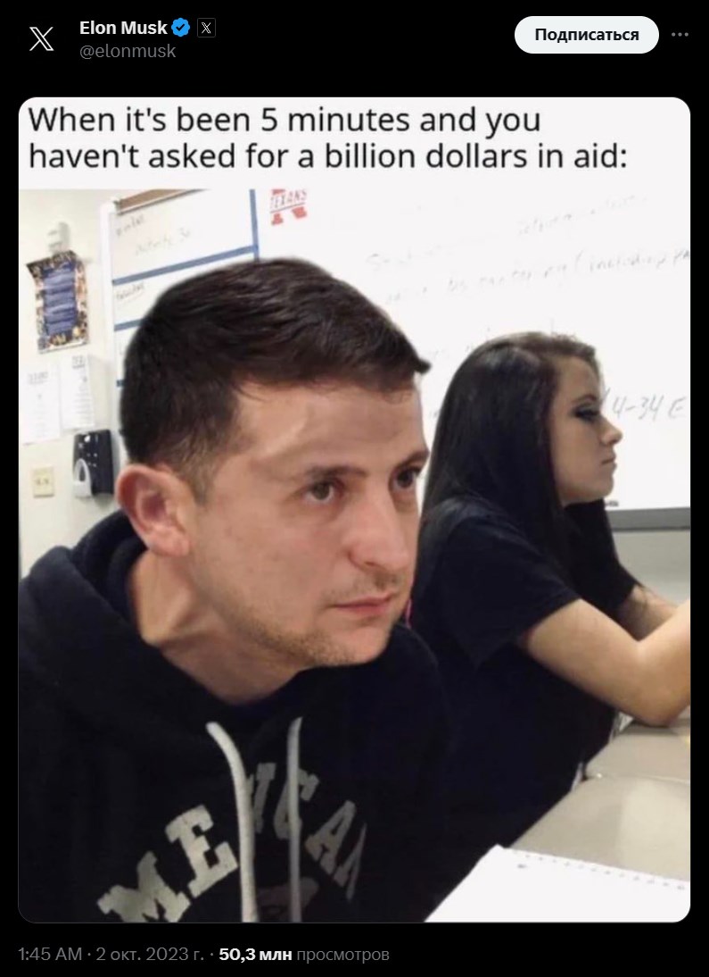 Илон Маск опубликовал сегодня мем с лицом, похожим на Владимира Зеленского, и подписью "Когда ты уже пять минут не просил миллиарда долларов помощи".