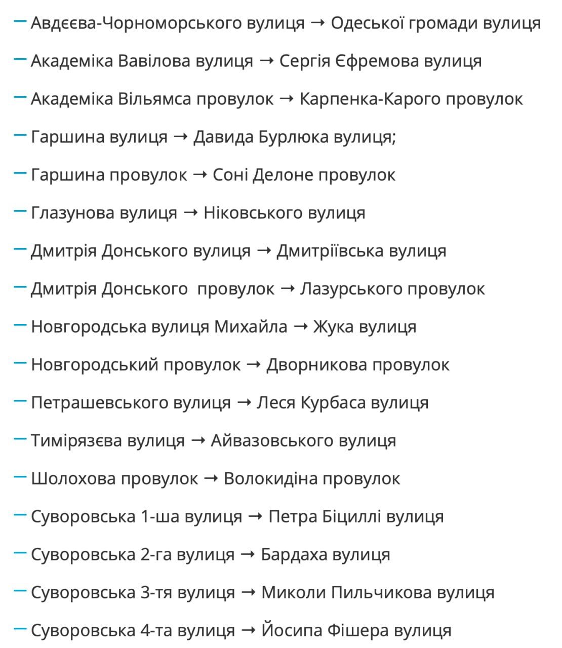 Остальные топонимы, вероятно, будут переименованы. В частности, 10-я Суворовская улица станет Богомольца, Донского - Дмитреевской, переулок Шолохова - Волокидина. Полный список - на изображении.