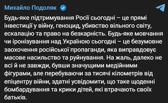 Высказался в подобном ключе и советник главы Офиса президента Михаил Подоляк.