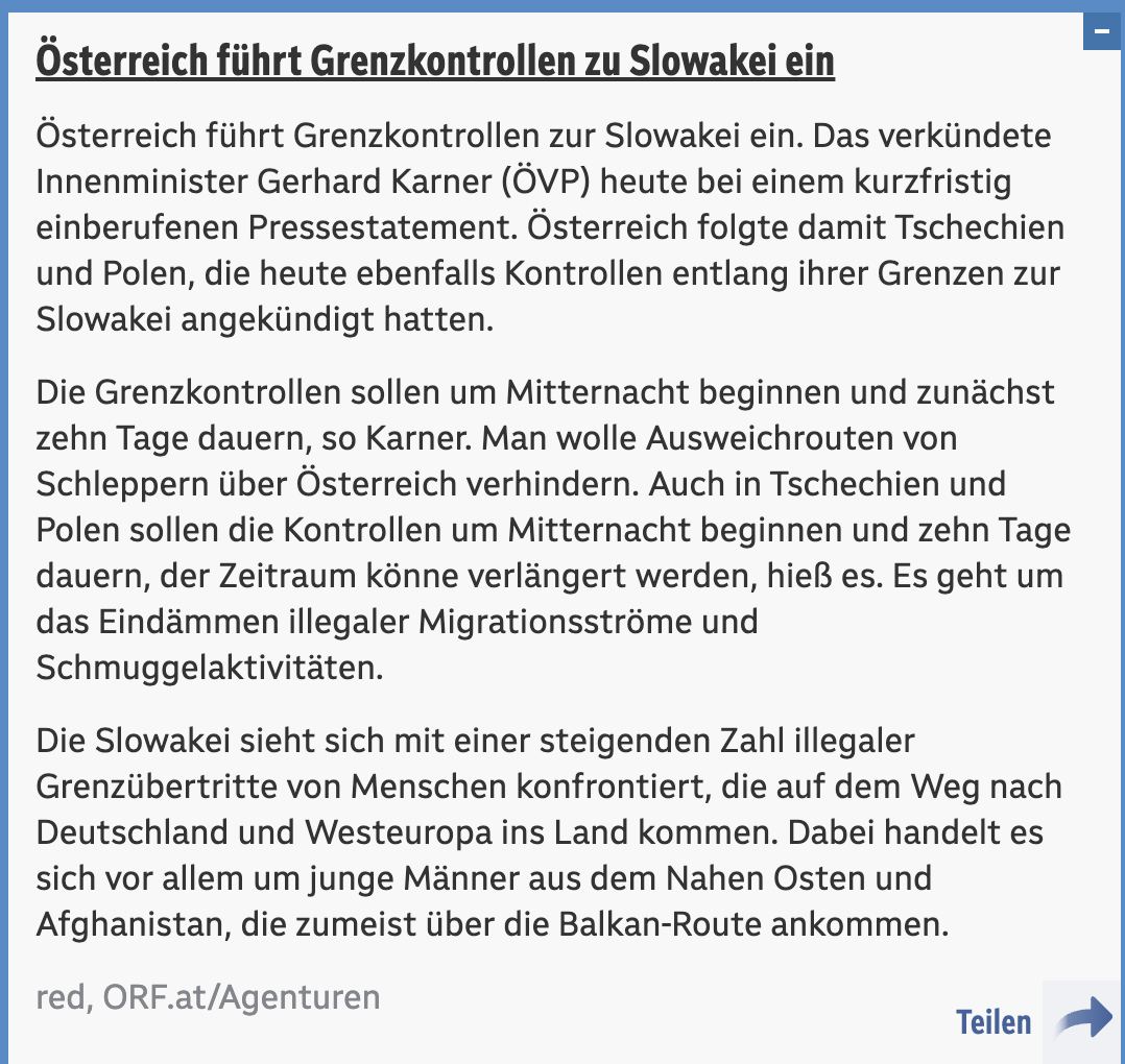 "С 4 октября мы временно вводим контроль на границе со Словакией. Это мера, необходимая для эффективной борьбы с группировками контрабандистов и нелегальной миграцией. Проверки будут проводиться выборочно по всей длине границы со Словакией таким образом, чтобы как можно меньше ограничивать трансграничное движение и не создавать излишней нагрузки на движение или пассажиров. Этот шаг мы делаем по согласованию с Польшей, которая аналогичным образом будет контролировать свою границу со Словакией. Мы, конечно, находимся в контакте как со словацкой стороной, так и с нашими австрийскими и немецкими соседями. Мы планируем проверки до 13 октября, возможное продление будет зависеть от текущей ситуации", - сказано в посте.