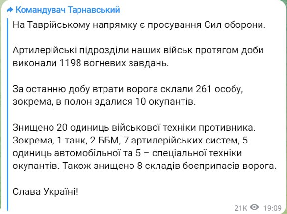 Между тем командующий оперативно-стратегической группировкой войск "Таврия" Александр Тарнавский сообщил, что на Таврийском направлении есть продвижение сил обороны.
