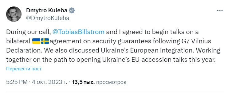 Вопрос начала переговоров был затронут во время разговора Дмитрия Кулебы со шведским коллегой Тобиасом Бильстремом.