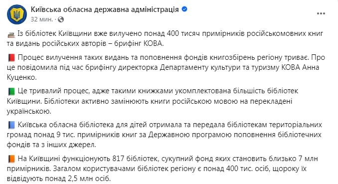 По ее словам, процесс изъятия изданий на русском языке и пополнения фондов библиотек региона продолжается. Он длительный, ведь такими книгами укомплектовано большинство библиотек Киевщины. Библиотеки активно пополняют книгами, переведенными на украинский.