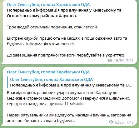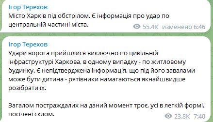 Мэр Харькова Игорь Терехов сообщил, что был прилет был по гражданской инфраструктуре и по жилому дому. Есть неподтвержденная информация, что под его завалами может быть ребенок.
