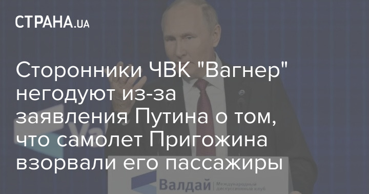 В телеграм-каналах, близких к ЧВК "Вагнер", негодуют по поводу вчерашних заявлений Владимира Путина на заседании клуба "Валдай", из которых следует, что основной версией гибели Евгения Пригожина в авиакатастрофе является подрыв ручной гранаты на борту кем-то из пассажиров.