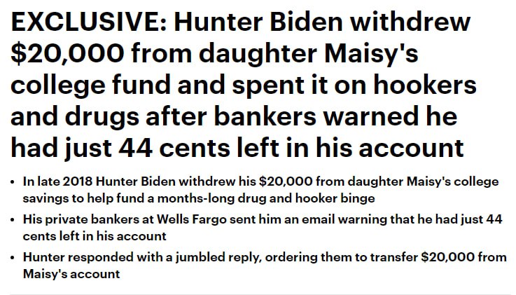 Согласно обнародованной переписке, в конце 2018 года Хантер Байден забрал 20 тысяч долларов из сбережений на колледж для его дочери Мейзи, чтобы оплатить "многомесячный запой с наркотиками и проститутками".