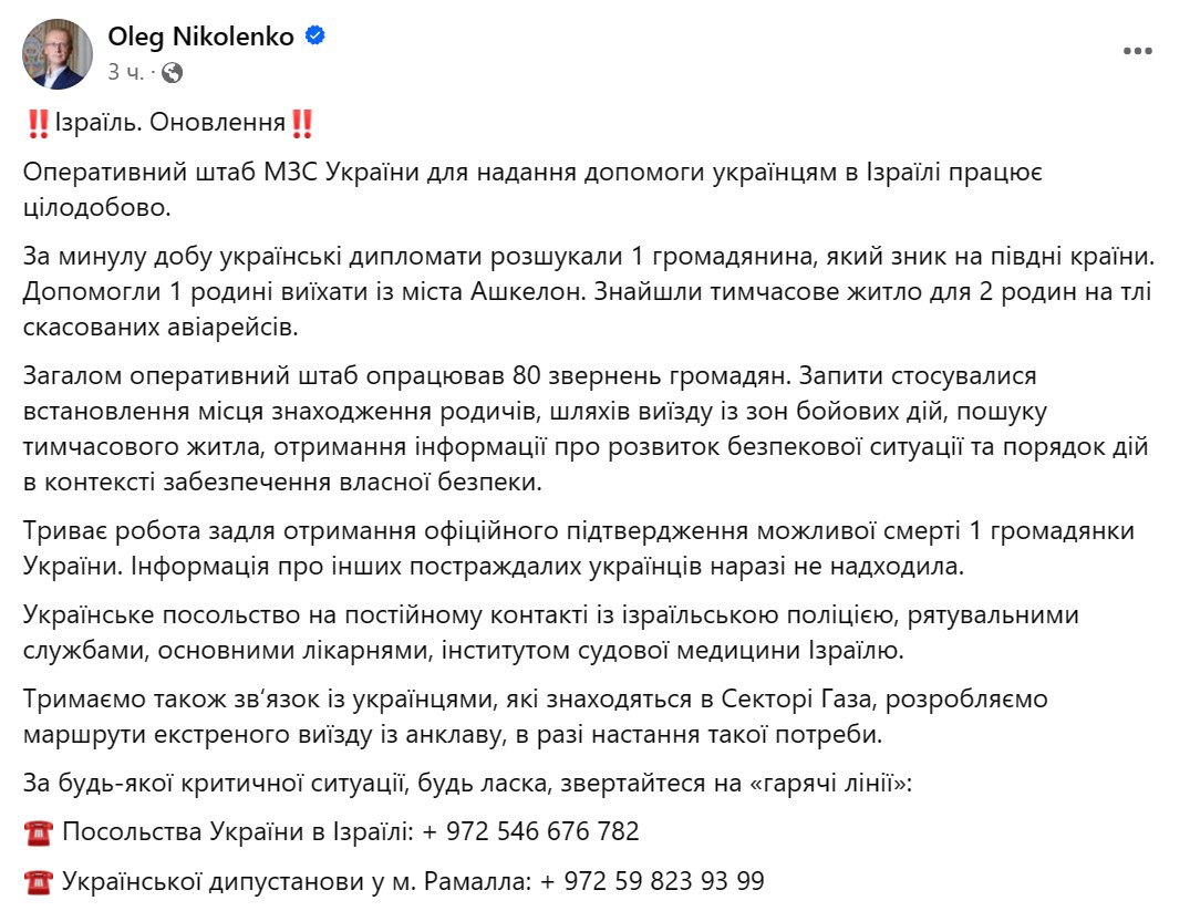 Также представитель МИД Олег Николенко сообщил, что украинские дипломаты разыскали одного гражданина Украины, пропавшего на юге Израиля. При каких обстоятельствах его нашли - не сообщается.