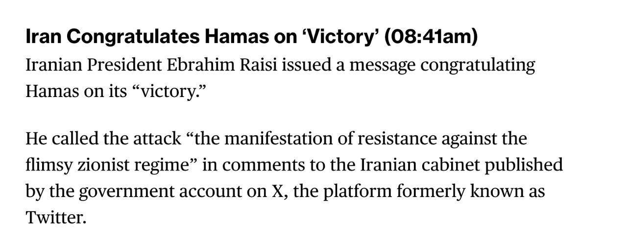 Bloomberg пишет, что президент Ирана поздравил ХАМАС с "победой"
