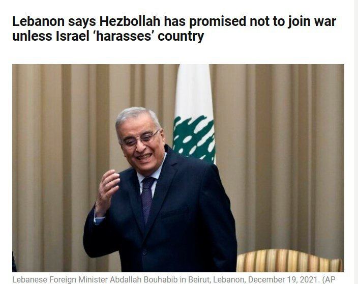 "Глава МИД Ливана Абдалла Бухабиб в понедельник заявил, что его правительство получило гарантии от "Хезболлы", что оно не присоединится к боям, если только Израиль не будет притеснять Ливан", — говорится в сообщении.