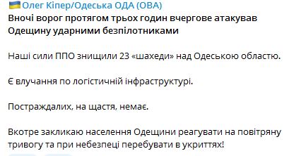 "Есть попадания по логистической инфраструктуре. Пострадавших, к счастью, нет", - написал Олег Кипер.