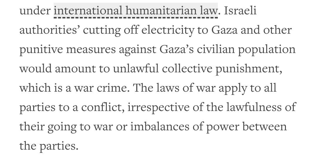 Также там отмечают, что "Израиль неоднократно наносил неизбирательные авиаудары, в результате которых погибли десятки мирных жителей (уничтожив целые семьи), а также удары, нацеленные на мирных жителей или гражданскую инфраструктуру, включая разрушение высотных башен Газы, населенных домов и предприятий, без каких-либо очевидных военных целей в окрестностях".