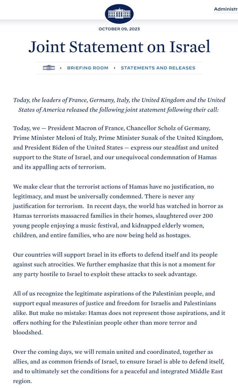 Белый дом опубликовал совместное заявление Франции, Германии, Италии, Британии и США касательно вторжения ХАМАС в Израиль.