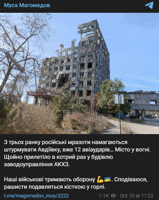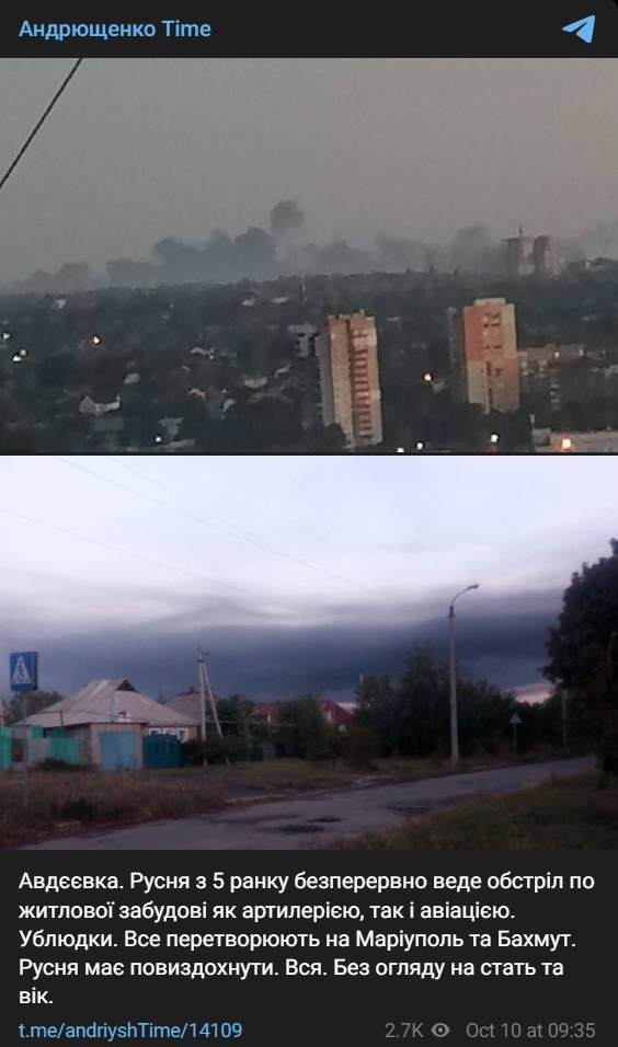 "Авдеевка. Русня с 5 утра беспрерывно ведет обстрел по жилой застройке как артиллерией, так и авиацией.