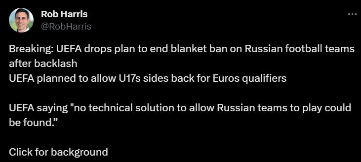 Ранее исполком УЕФА допустил к своим турнирам сборные России с футболистами не старше 17 лет. В ответ сразу несколько стран объявили, что будут бойкотировать матчи с молодежными командами РФ. Помимо Украины, о бойкоте заявили Англия, Швеция, Дания, Литва, Латвия, Норвегия и Польша.