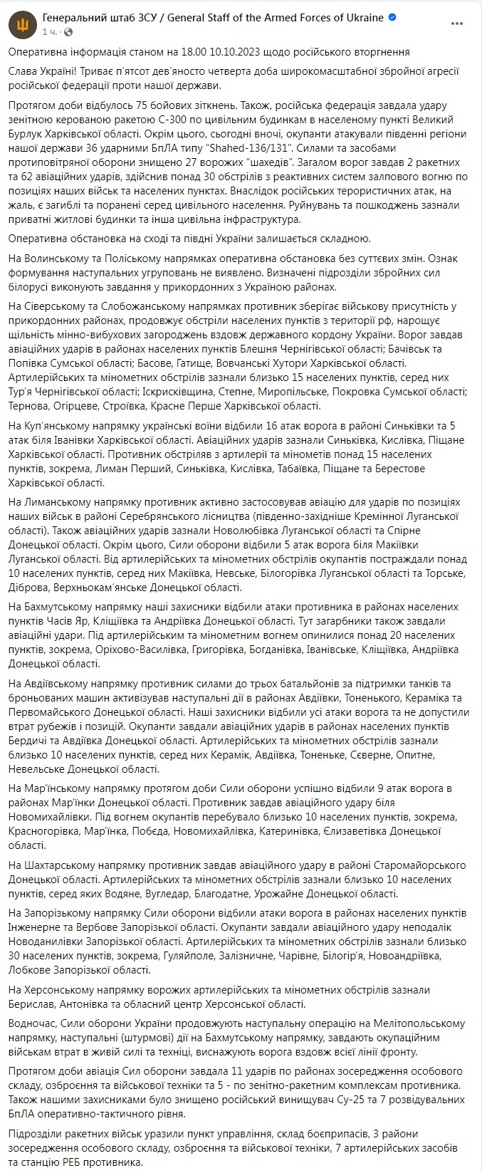 Генеральный штаб ВСУ опубликовал оперативную информацию о ситуации на фронте по состоянию на 18:00 10 октября.