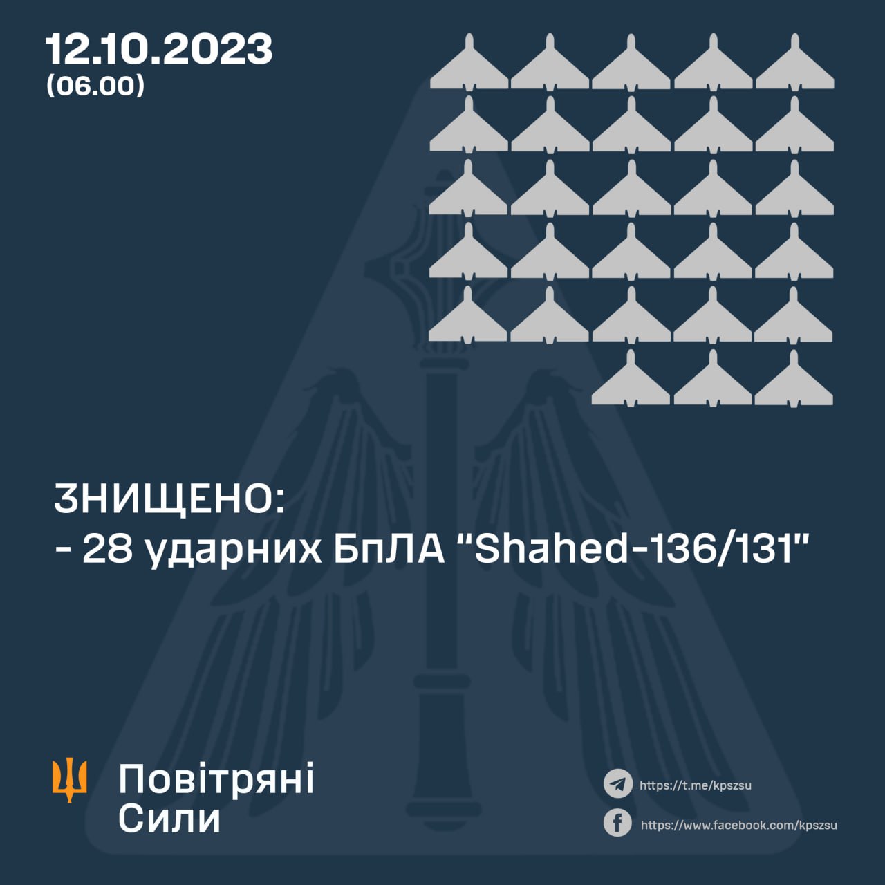 Ночью 12 октября Украину атаковали 33 беспилотника "Шахед" с северного и южного направлений. ПВО сбила 28 дронов, из них десять - в Одесской области. Остальные - еще в пяти областях.