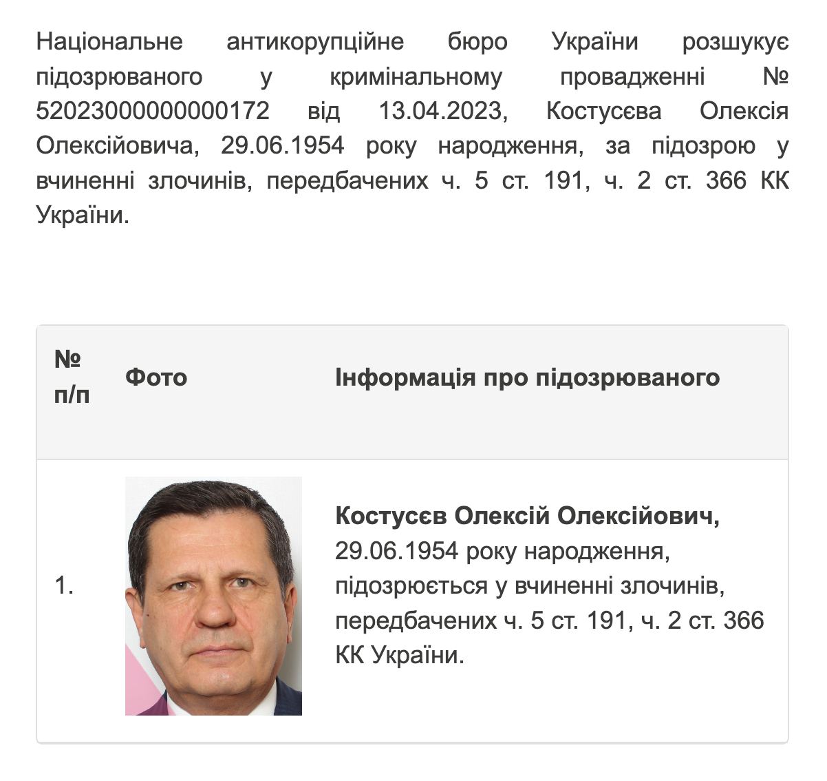 Национальное антикоррупционное бюро Украины (НАБУ) объявило в розыск отца народного депутата из "Европейской солидарности" Алексея Гончаренко, бывшего мэра Одессы Алексея Костусева.