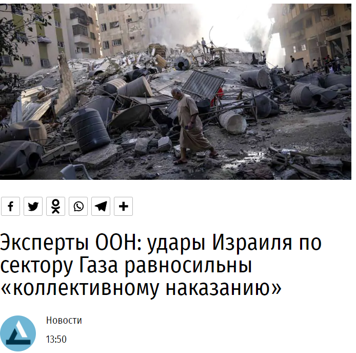 "Это равносильно коллективному наказанию. Нет никакого оправдания насилию, которое неизбирательно и направлено против невинных гражданских лиц, будь то со стороны ХАМАС или израильских сил. Это абсолютно запрещено международным правом и равносильно военному преступлению", — говорится в заявлении группы экспертов ООН.