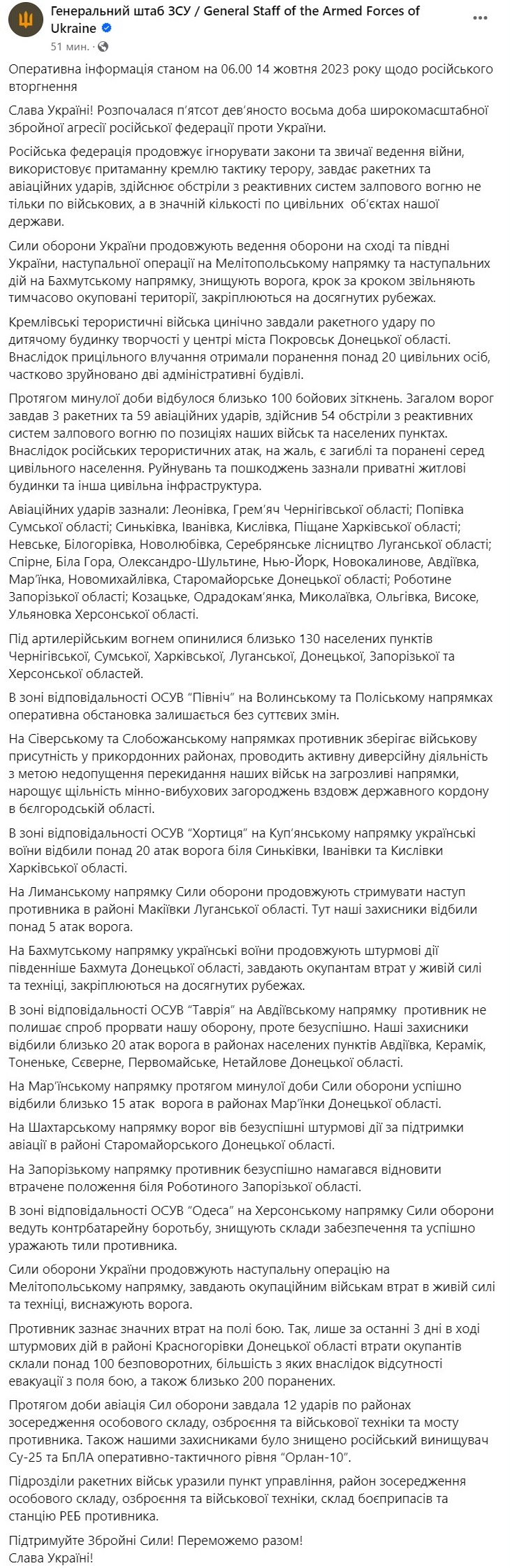 За прошедшие сутки произошло около 100 боевых столкновений. Всего РФ нанесла 3 ракетных и 59 авиационных ударов, совершила 54 обстрела из реактивных систем залпового огня по позициям наших войск и населенным пунктам.