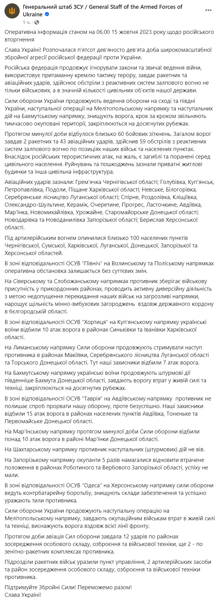 Война в Украине идет уже 599-й день. Мы следим за последними новостями и ключевыми событиями 15 октября 2023 года в обновляемом онлайне.