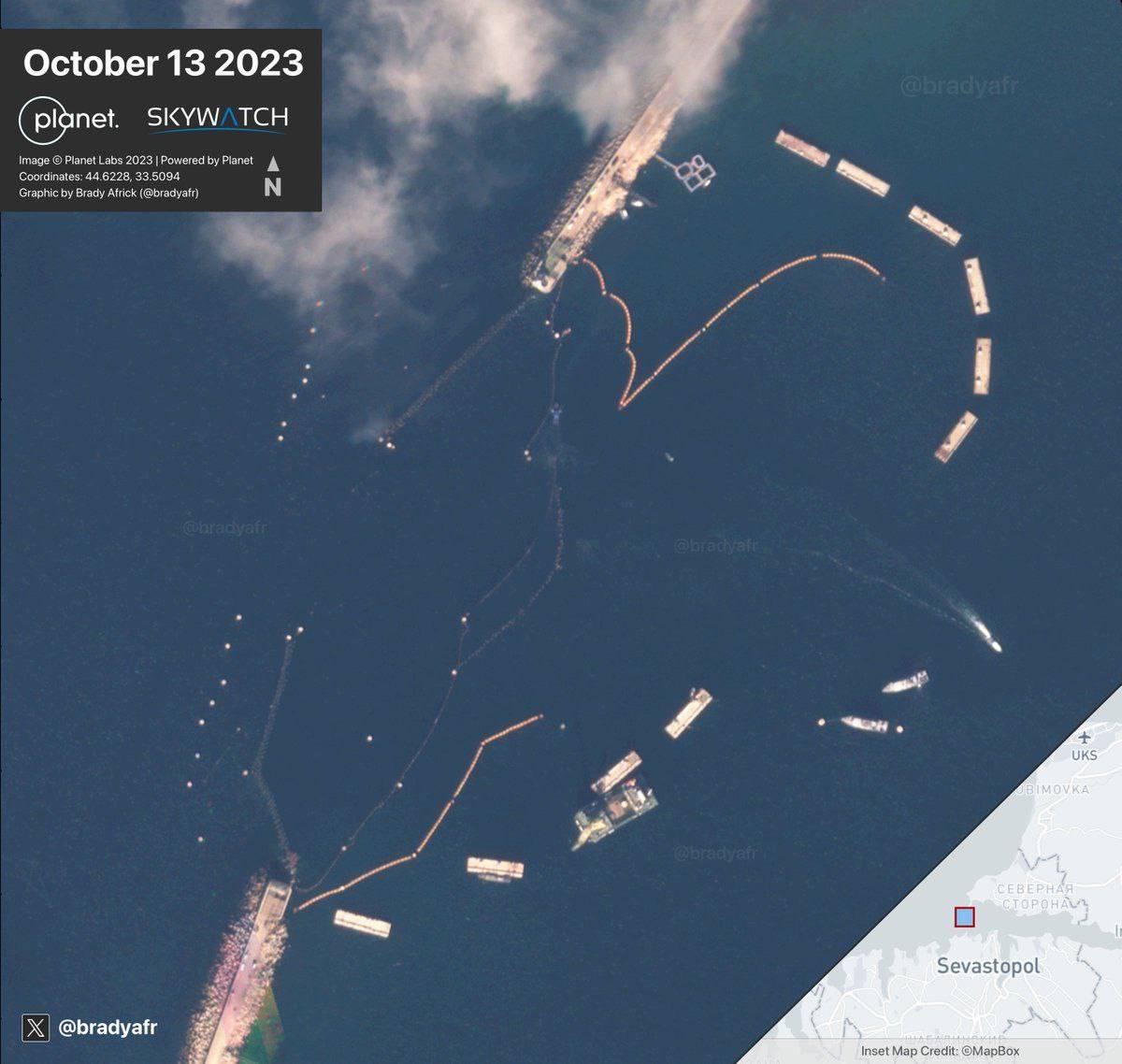 На спутниковом снимке заметно, что россияне на входе в Севастопольскую бухту установили заграждения. Снимок сделан 13 октября 2023 года.