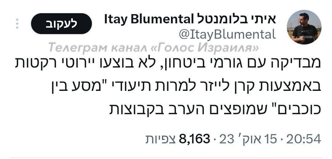 Вскоре после появления новости о применении оружия журналист Итай Блюменталь сообщил в соцсети, что его источники в сфере безопасности не подтверждают использования Израилем ПРО "Железный луч".