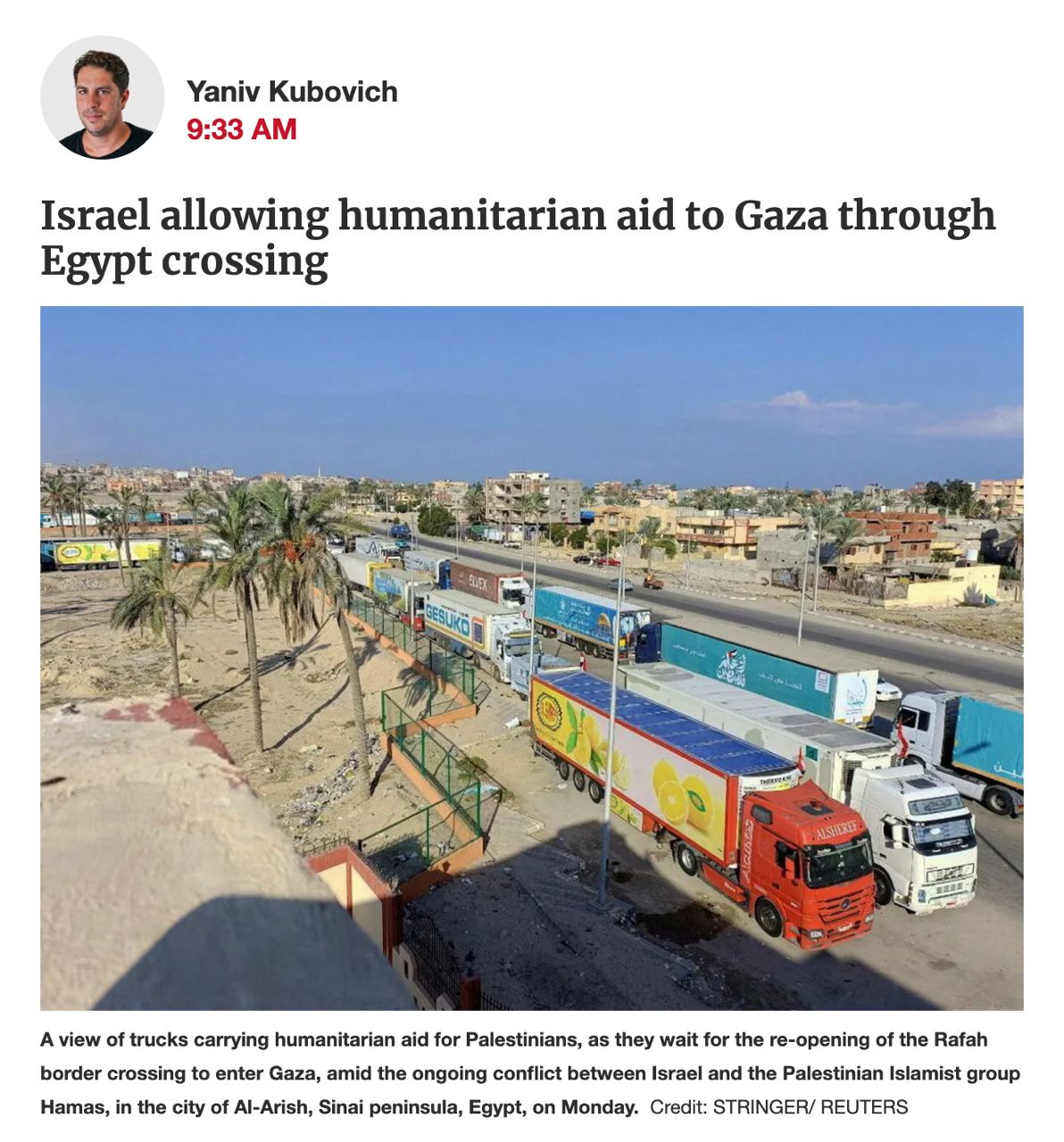 Израиль разрешил пропуск гуманитарной помощи в Газу из Египта через КПП Рафах, колонны которой ранее стояли на границе.
